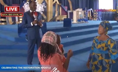 Stephanie Otobo's mom and her sister were live at Omega Fire Ministry, Auchi, Edo State, and allagedly begged Apostle Suleman, during today's service,
