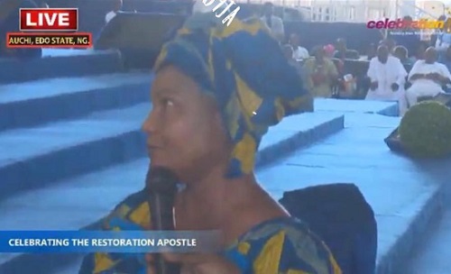 The mother of Stephanie Otobo, the Canada-based Nigerian singer, who was arrested for allegedly blackmailing Apostle Suleman, has been seen live this Sunday morning at the Omega Fire Ministries (OFM) Worldwide, Auchi in Edo State, during the service begging the General Overseer for forgiveness unbehalf of her daughter.