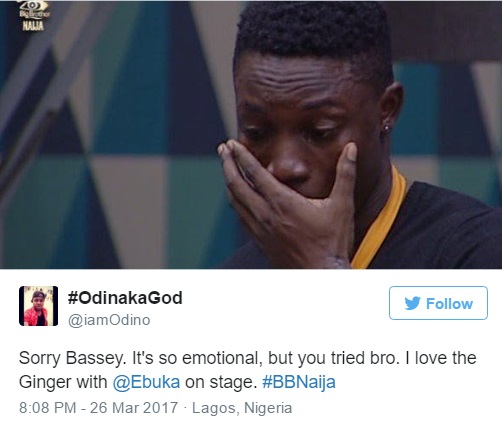 But, the party must always end for somebody and soon it was down to business as Ebuka got the Nominated four to stand and it was the muscle-man "pepper boy" who bowed out with Debie-Rise this week's inconsolable sobber. We didn't see that one coming.