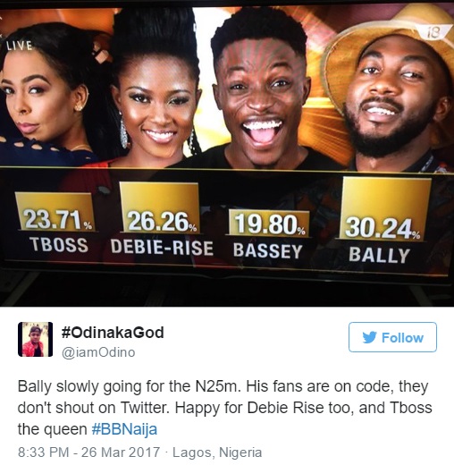 She also said that she wouldn't really miss anyone in the House, we are guessing, Efe least of all. When Biggie quizzed them on who they thought would be going home tonight, three out of the four said Bally.