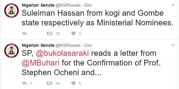 The names of the two ministerial nominees sent to the Senate for confirmation by President Muhammadu Buhari has now been revealed by Senate President, Bukola Saraki.