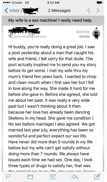 Relationship blogger, Joro Olumofin has shared the story of a man whose wife is reported to have an insatiable urge for s*x.