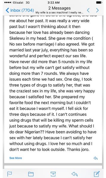 According to the faceless man, his wife demands for 7 solid rounds of s*x before she can reach 'cloud 9'. This has forced him into taking some s*x-enhancing drugs militating against his health.