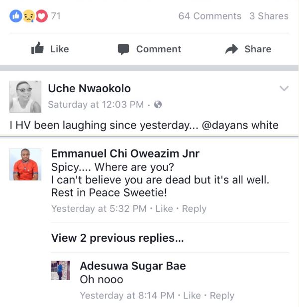 Efforts by social media users to reach her on details of what may have led to her death proved abortive as she did not reply Facebook messages that were sent to her.