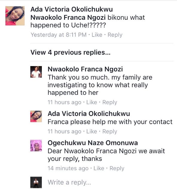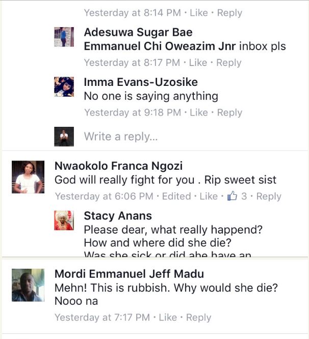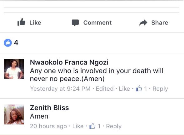 Her sister, Nwaokolo Franca Ngozi made a comment on a post she made after her sister’s death stating that anyone that is involved in her death will never know peace. According to her, her family is still investigating the cause of her death.