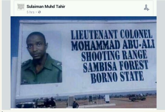 Here is a sign-post erected in Borno State, north-eastern part of Nigeria in honour of the slain soldier. The gigantic signppost read "Lieutenant Colonel Mohammad Abu-Ali Shooting Range, Sambisa Forest, Borno State"