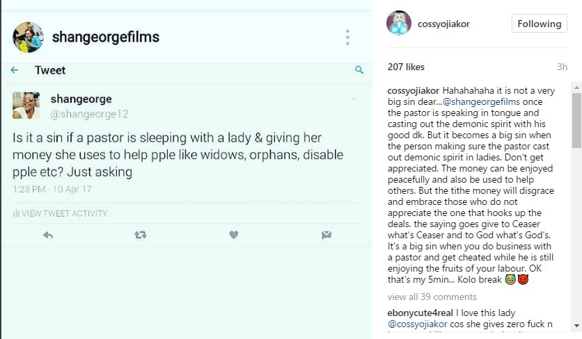 While replying her, Cossy wrote: "Hahahahaha it is not a very big sin dear...@shangeorgefilms once the pastor is speaking in tongue and casting out the demonic spirit with his good d**k. But it becomes a big sin when the person making sure the pastor cast out demonic spirit in ladies don't get appreciated. The money can be enjoyed peacefully and also be used to help others.