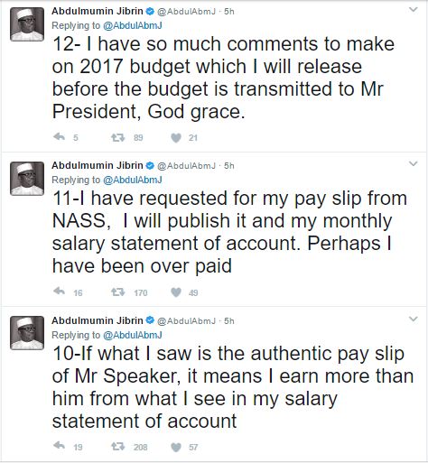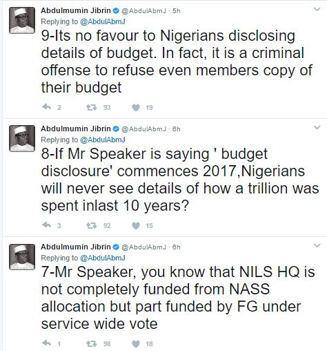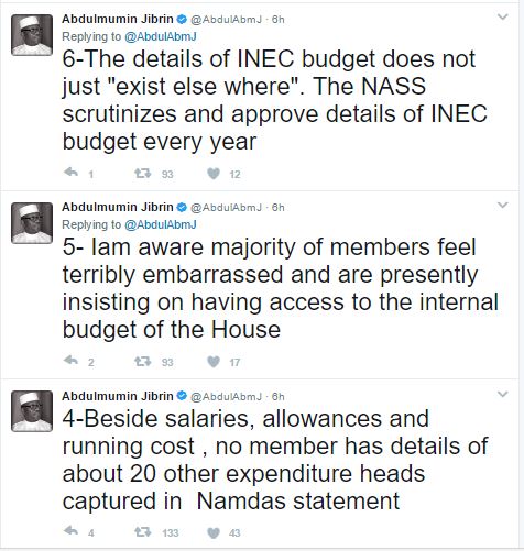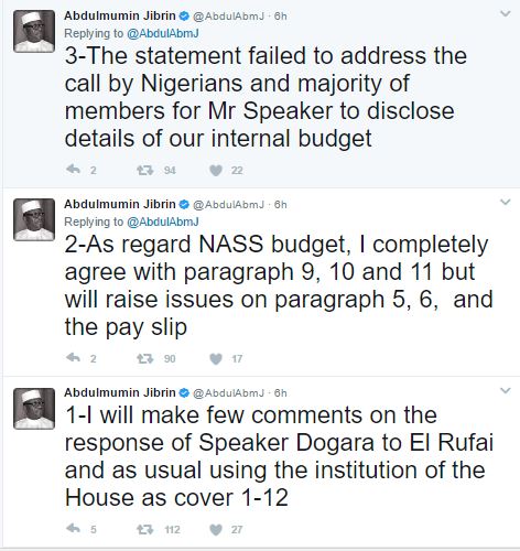 While making his reaction known on Twitter, Jibrin said that if what Dogara made available to the public was authentic, then he (Jibrin) earned more than the speaker. Jibrin argued that Dogara has refused to make available details of the National Assembly budget and the allowances accrued to the lawmakers.
