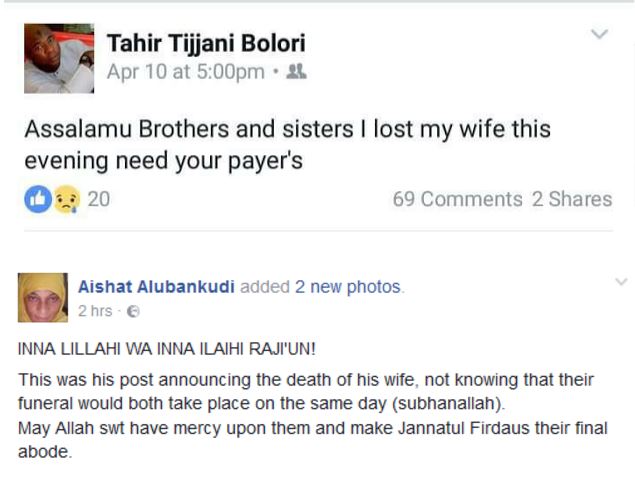 He died on Monday, April 10 few hours after his wife died. He had posted the sad news of his wife's death on Facebook saying: "Assalamu brothers and sisters, I lost my wife this evening. I need your prayers." he wrote.