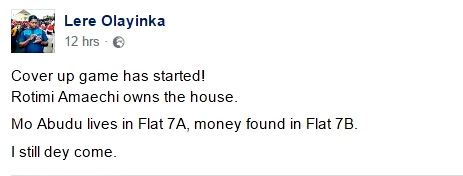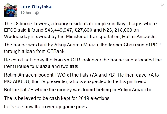 In a statement made on his Facebook page, the Special Assistant on Public Communications and New Media to Governor Ayodele Fayose of Ekiti State, Lere Olayinka, alleged that the Minister of Transportation, Rotimi Amaechi, owns the house where the alleged looted money was found by the anti-graft agency.