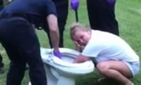 She was filmed as firemen removed the porcelain throne and carried it onto the backyard with Ms Henderson still attached.