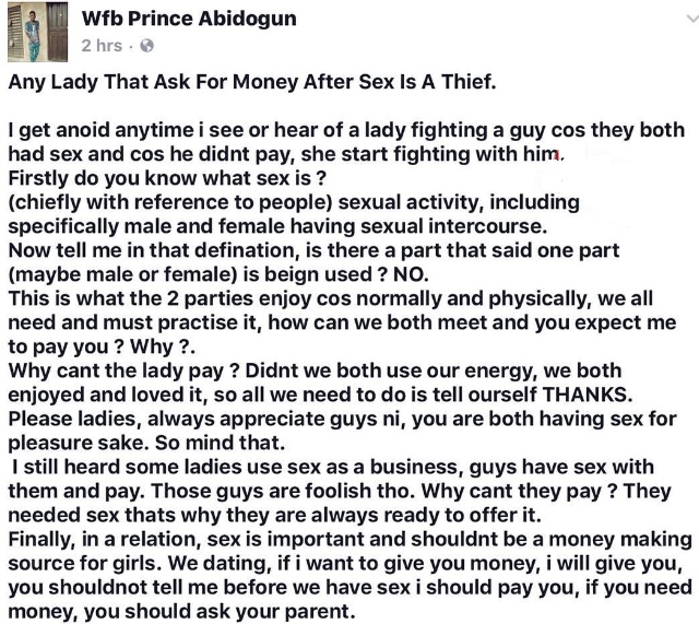 A Nigerian online media personality identified as Prince Abidogun, has been trailed with criticisms and mixed reactions after he said that any lady that asks for money after s*x is a thief.