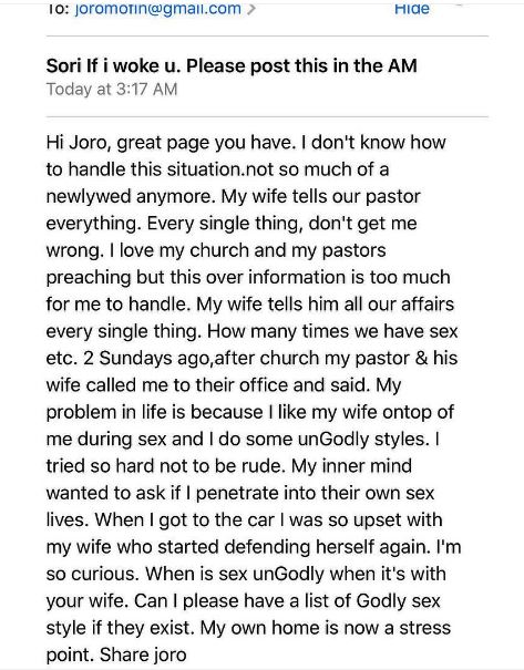 According to the unnamed man who wrote to Joro Olumofin - a relationship blogger, his wife has been discussing their s*xual activities with their pastor and his wife.
