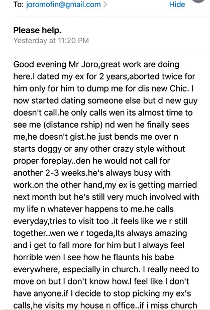 Popular Lagos-based Psychologist and Relationship therapist, Joro Olumofin, has taken to his Instagram blog page and shared the story of a lady who is still stuck with her former boyfriend even though they've parted ways.