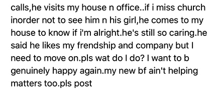 The lady is seeking advise as her new lover don't show her love, and as a result, she finds herself still sleeping with her former boyfriend who is already dating someone else.