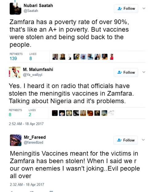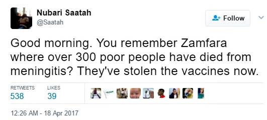 A Twitter user identified as Nubari Saatah (@Saatah) has taken to the social networking platform to reveal to Nigerians that the Meningitis vaccines provided by the federal government which is meant for the thousands of victims in Zamfara State, have been reportedly stolen by officials and are being re-sold.