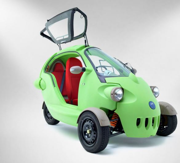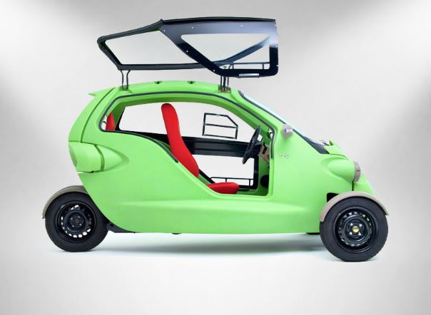 This little bug-eyed three-wheeled electric vehicle is called ‘Sam’. The vehicle’s cartoon-like form, made of fully-recyclable high-density polyethylene, consists of only four panels and is accessed via a folding gull-wing door.