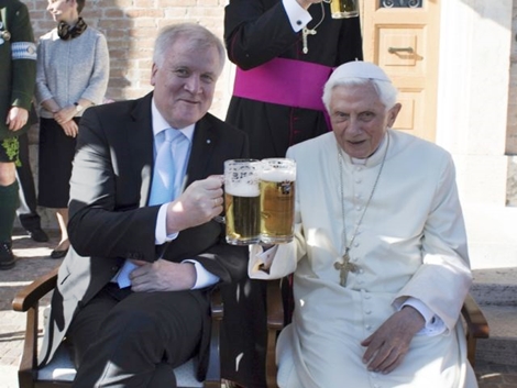 From left, Bavarian Prime Minister Horst Seehofer, Pope Emeritus Benedict XVI and his brother Georg have a glass of beer on the occasion of a party for Benedict's 90th birthday, at the Vatican Monday, April 17, 2017. (L'Osservatore Romano/Pool Photo/AP)