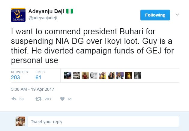 Deji Adeyanju, a staunch critic of the President Muhammadu Buhari administration yesterday ate the humble pie to salute the suspension and investigation of the DG of National Intelligence Agency (NIA), Ayo Oke.