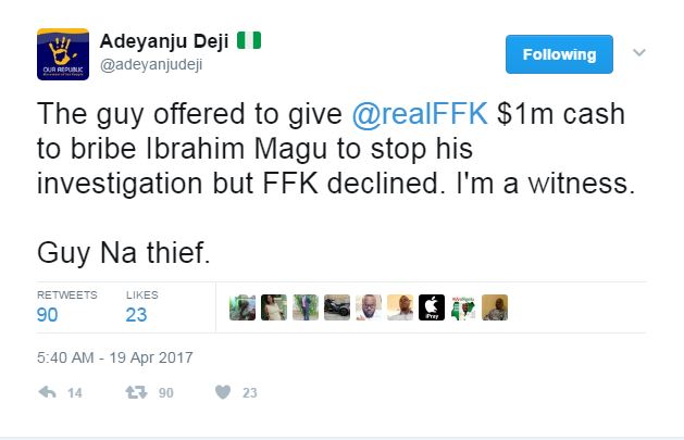 He alleged that Oke who is being linked to the N13billion uncovered by the Economic and Financial Crimes Commission at the prestigious Osborne Towers in Ikoyi, Lagos of trying to bribe the Chairman of the anti-graft body, Ibrahim Magu with $1 million.