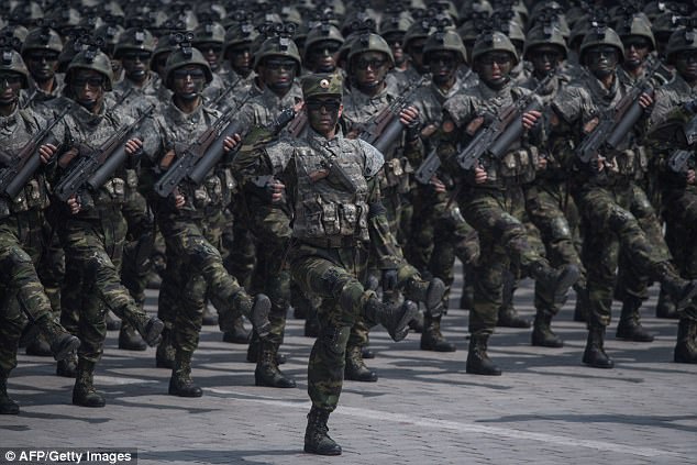 Thousands of goose-stepping troops paraded through Pyongyang in a show of strength on Saturday