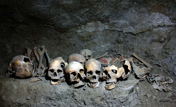 Scientists are now wondering what happened at the city and why it was abandoned. Terrifying pictures show rows of damaged skulls and bones on a stone ledge and littering the floor of the cave.