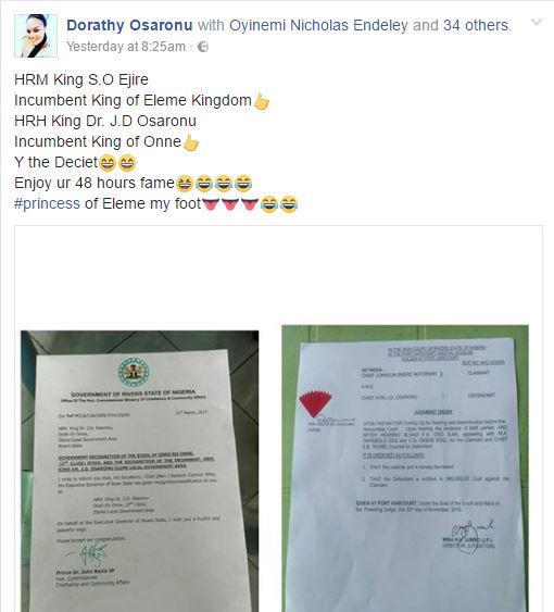 Osaronu shared a document baring the logo of the Rivers State Government recognising one Dr. JD Osaronu who she claimes is her father as the ruler of the Eleme kingdom.