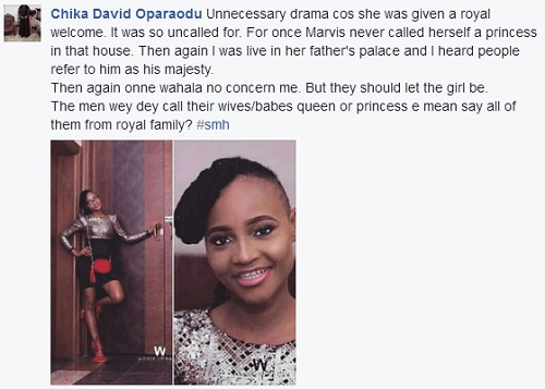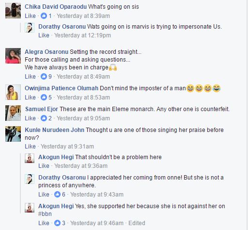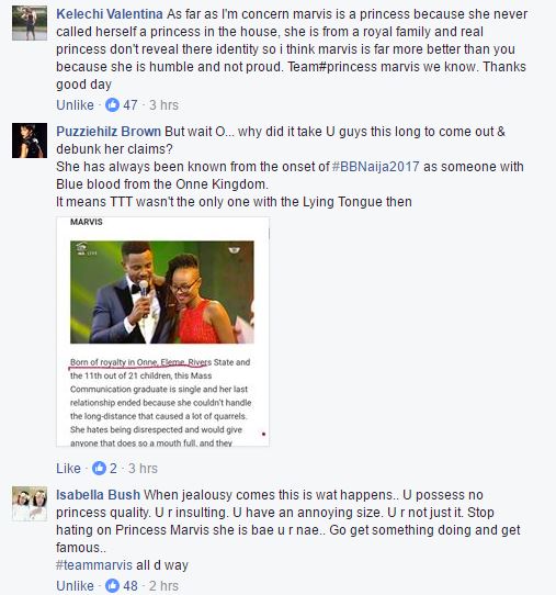Big Brother Naija housemate, Marvis Nkpornwi has been put on the spotlight again by a Facebook user who accused her of lying that she is a princess.
