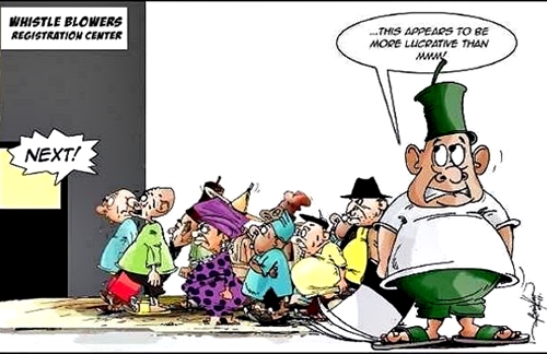 Two, given the level of polarization in Nigeria, it can be speculated that the reported high interest shown by many to become whistle-blowers is driven more by the love for lucre than any patriotic zeal. The twisted logic could be: if some could loot, the new policy gives those who do not have such opportunity a chance to get their own cut and level the playing field. It may be a perverted sense of social justice. Just imagine if a whistle- blower gets the minimum 2.5 per cent of the $43m reportedly found in an Ikoyi apartment by the Economic and Financial Crimes Commission (EFCC). That will be over $1m (N400m) - or several times more than what most ‘well-paid’ Nigerian professionals will ever make in their life time. In this context I can see the sense in the cartoon where the pupils said they would like to be whistleblowers when they grow up. However before you start thinking of quitting your job (or folding your business) to get your own cut, it will be wise to remember that there is a caveat to the government’s promise of monetary reward: the whistle-blower will get between 2.5 per cent (minimum) and five per cent (maximum) of the recovered loot, only if “there is a voluntary return of stolen or concealed public funds or assets on the account of the information provided”.