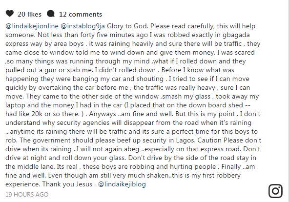 Tunde_Praise, whose Instagram profile reads that he is a media consultant, raised the alarm on Thursday after narrating how he was robbed in Gbagada, Lagos.