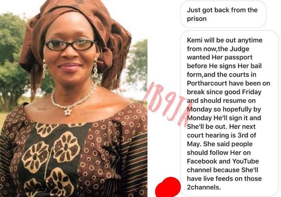 Kemi Omololu Olunloyo is reported to be regaining her freedom tomorrow following the fulfillment of her bail conditions.