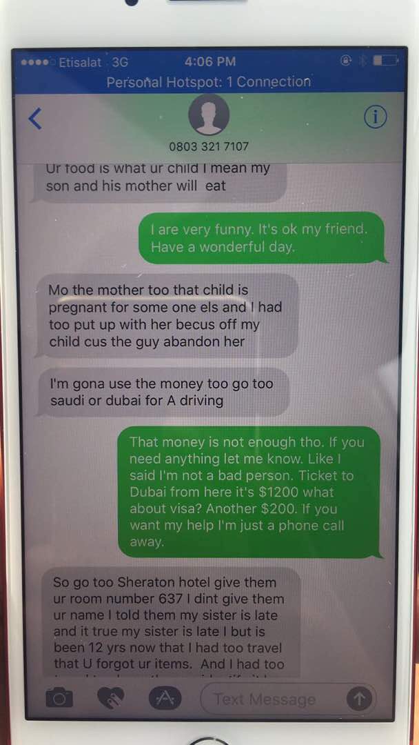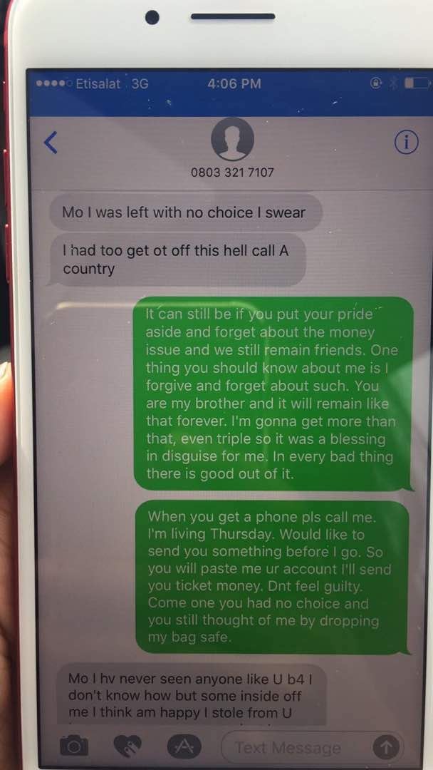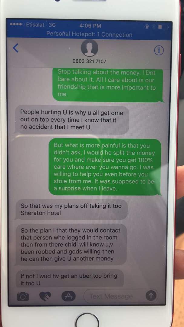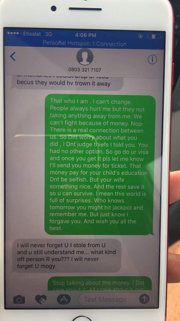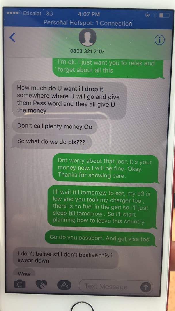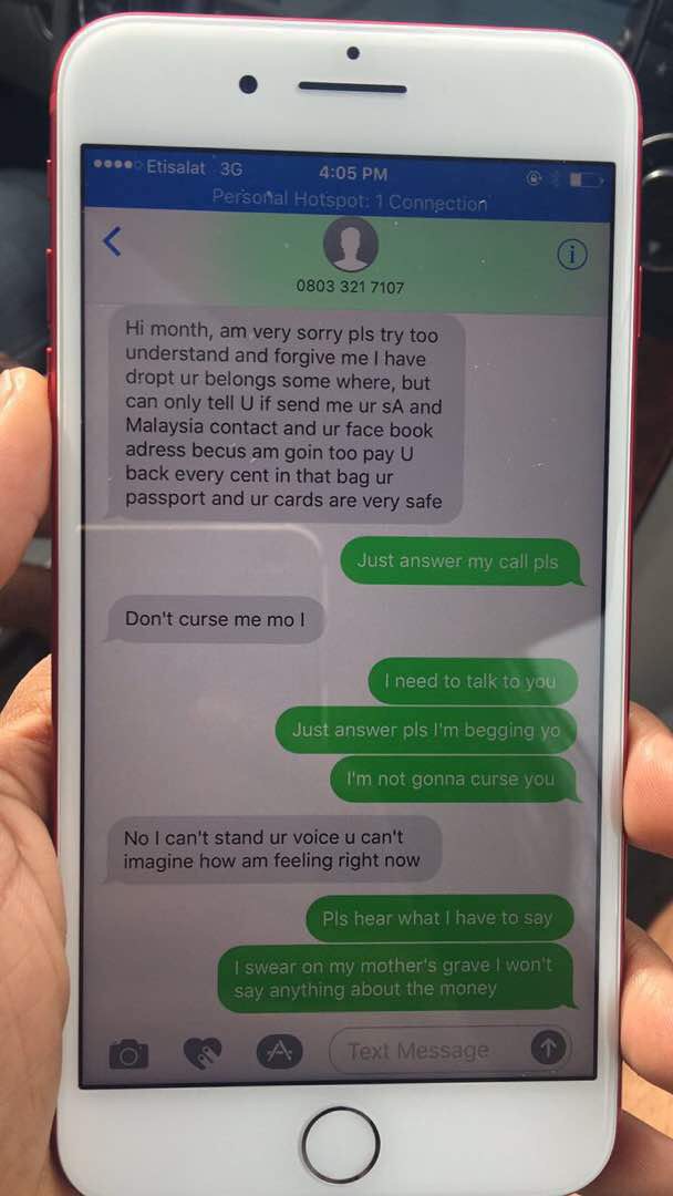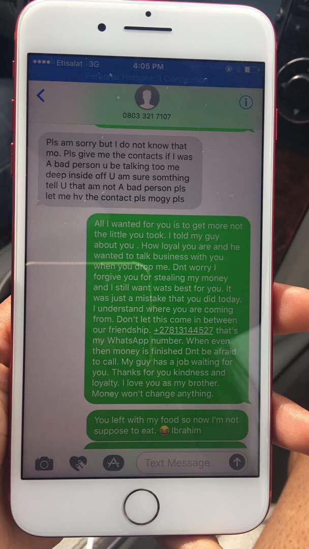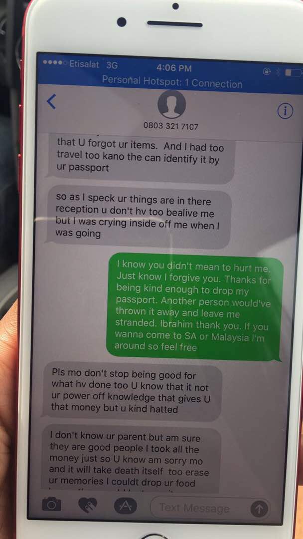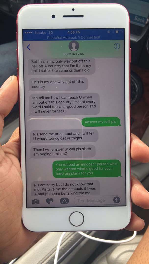 "He left me stranded on the road luckily, I had my phone on me because I wanted to buy something on the side of the road. I even bought him food and paid him more than what he was supposed to be paid and inside my bag it was my passport and money 500k naira and $2000.