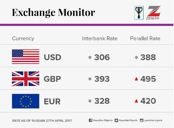 These are the currency exchange rates for today, April 27, 2017, powered by Zenith Bank Plc. The apex bank is currently working towards a convergence between value of the local currency in the interbank and parallel market rates.