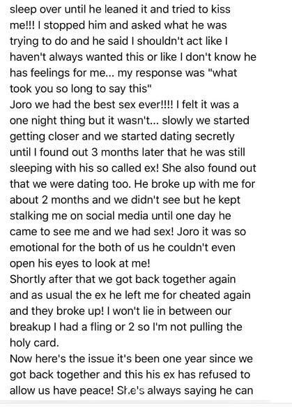 A young girl who for the past two years has been sharing the same boyfriend with a female friend has opened up on their off and on relationship.