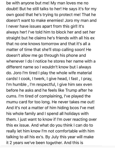 According to the girl, she has offered him good s*x, twerking and other intimate 'sexual partner' duties but this has refused to safely secure the man for him as he has been sleeping with his other lover.
