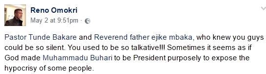 In a post on his Facebook, Omokri wrote, “Pastor Tunde Bakare and Reverend Mbaka, I never knew you guys could be so silent. You used to be so talkative!!!