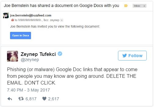 Writer and professor Zeynep Tufecki tweeted a screenshot showing how easily people could be fooled into clicking on the link.