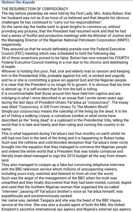 Simply put corpsocracy means the rulership of the living by the dead. It is the art of hiding a walking corpse, a comatose zombie or what some have described as the "living dead" in a cupboard in the Presidential Villa, telling the world that it is hale and hearty and then ruling and running the country in its name.