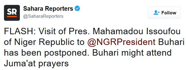 In a statement on the postponement of the proposed visit of the President of Niger Republic, Mahamadou Issoufou to Nigeria, Adesina noted that the re-scheduling was at the instance of the visiting president, as all arrangements had been made to receive him in Abuja, including plan ‘to attend the Juma’at prayers together’