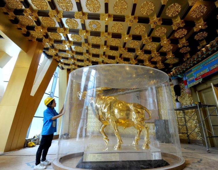 The sort of oxen you expect to see in Chinese villages tend to be pulling carts or tilling fields, not a beasts made of a ton of gold. This precious cow is located on the 60th floor of a 328m-tall skyscraper in Huaxi, China's richest village, and building that juts out of the eastern landscape like a giant tripod topped by a golden ball.