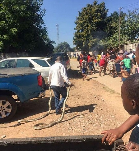 A man who was spotted dragging big snakes in the streets in the broad daylight on Sunday, brought a Mabvuku town, a high density suburb, some 17 km east of Harare, the capital city of Zimbabwe to a standstill as local residents witnessed a rare sight.