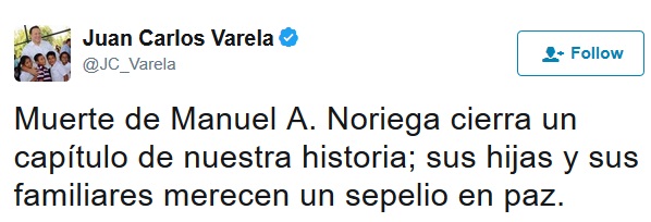 Juan Carlos Varela tweeted: “The death of Manuel A Noriega closes a chapter in our history; his daughters and their families deserve to bury him in peace.”