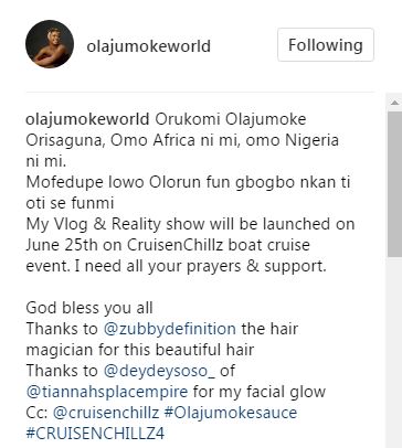 "My Vlog & Reality show will be launched on June 25th on CruisenChillz boat cruise event. I need all your prayers & support. God bless you all" she wrote on Instagram.