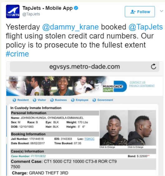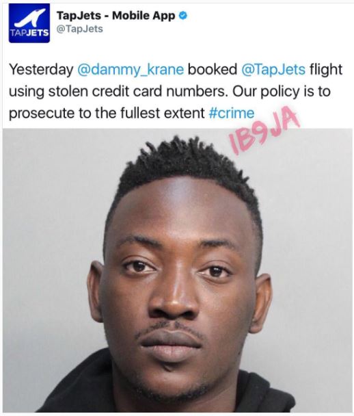 The verified twitter account of Tap Jets, a private airline company has come out to claim responsibility for handing the singer over to the police tweeting that he attempted to book Tap Jets flight using stolen credit card numbers. They vowed to prosecute him to the full extent of the law.
