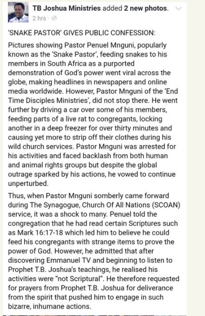 Thus, when Pastor Mnguni somberly came forward during The Synagogue, Church Of All Nations (SCOAN) service, it was a shock to many. Mnguni told the congregation that he had read certain Scriptures such as Mark 16:17-18 which led him to believe he could feed his congregants with strange items to prove the power of God.