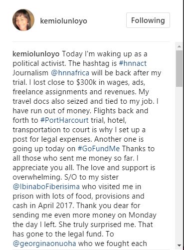 “Today I’m waking up as a political activist. The hashtag is #hnnact Journalism @hnnafrica will be back after my trial. I lost close to $300k in wages, ads, freelance assignments and revenues. My travel docs also seized and tied to my job. I have run out of money. Flights back and forth to #PortHarcourt trial, hotel, transportation to court is why I set up a post for legal expenses. Another one is going up today on #GoFundMe Thanks to all those who sent me money so far. I appreciate you all. The love and support is overwhelming. S/O to my sister @IbinaborFiberisima who visited me in prison with lots of food, provisions and cash in April 2017. Thank you dear for sending me even more money on Monday the day I left. She truly surprised me. That has gone to the legal fund. To @georginaonuoha who we fought each other vigorously, it is well. I read your appeal to #AsoRock to release me. May God protect you and your lovely girls. No curse will befall them. I no longer place curses on people’s heads. GOD FORBID. I love you all