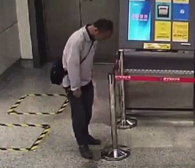 A video clip which was captured on the morning of June 6 2017, and shows the moment a man walking across the floor of a subway station with his hand grabbing his butt, and then walked over to the automatic ticket machine and moves around a bit, acting all nervous, have emerged online.