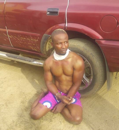 The suspect was paraded with the head of a woman, intestine, lung, vagina, liver and a bottle containing blood. The human parts were recovered fresh from the suspect in his car with registration no: LSD 987 DJ when he was arrested.