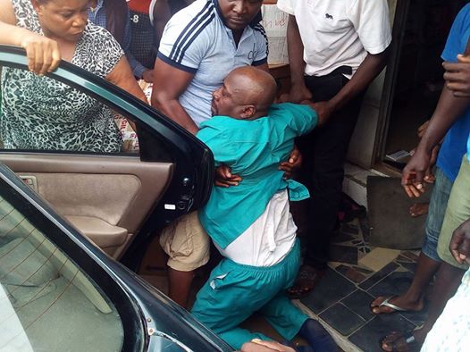 The aftermath: he is now being dragged by the husband to the woman who is also an official of the Nigerian police force. The film don turn sawa, he is now pretending, fainting etc.