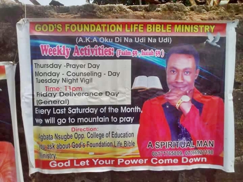 The self-acclaimed 'Spiritual man', and pastor of God's Foundation Life Bible Ministry, was reportedly exposed by angry residents of Abata Nsugbe area in the state who destroyed the church only to find his shrine with charms and other diabolical items.
